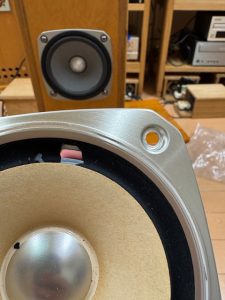 以前使っていたスピーカーユニットは20年以上経っているのでエッジがもろくなり穴が開きました。(写真1)