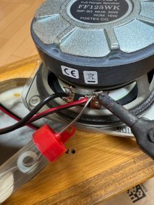 元のスピーカーユニットをボックスから取り出して結線を切り離し新しいユニットにスピーカーケーブルをハンダ付けします。(写真3)