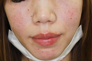 赤みは頬部が多く、鼻や眉間や顎にも見られます。