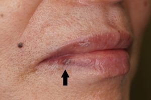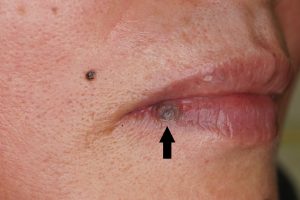 下唇の右端に暗紫色の腫瘤があり、ほくろと認識していました。